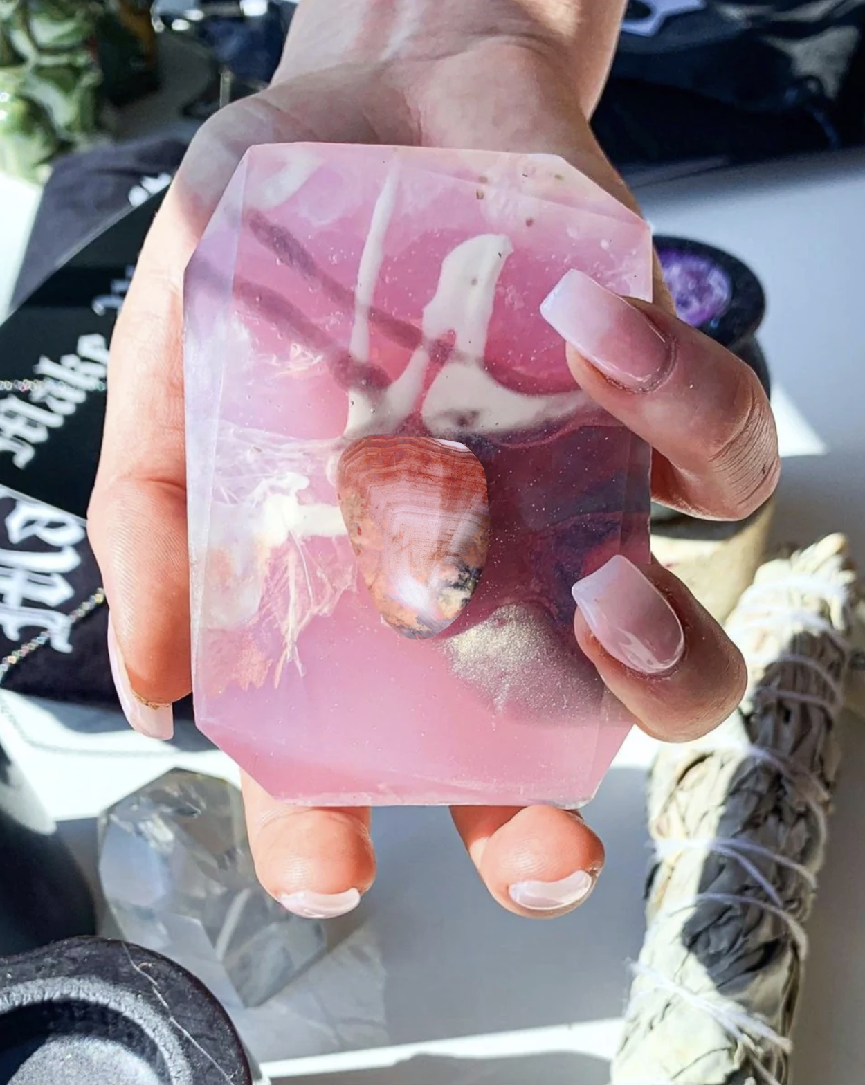 Awaken the Sorcess connects you to your healing heart center and fills your body with waves of warm soothing energy. Embedded with Pink Botswana Agate this soothing stone helps you ease through any transitions with positivity and grace. It has a slower frequency than other stones and its banded lace brings waves of comfort and peace and connects your heart to the portal of life. This stone connects to the heart chakra, supporting, stabilizing, and clearing one of the negative emotions so that one is able to view life with a heart-centered loving awareness.
