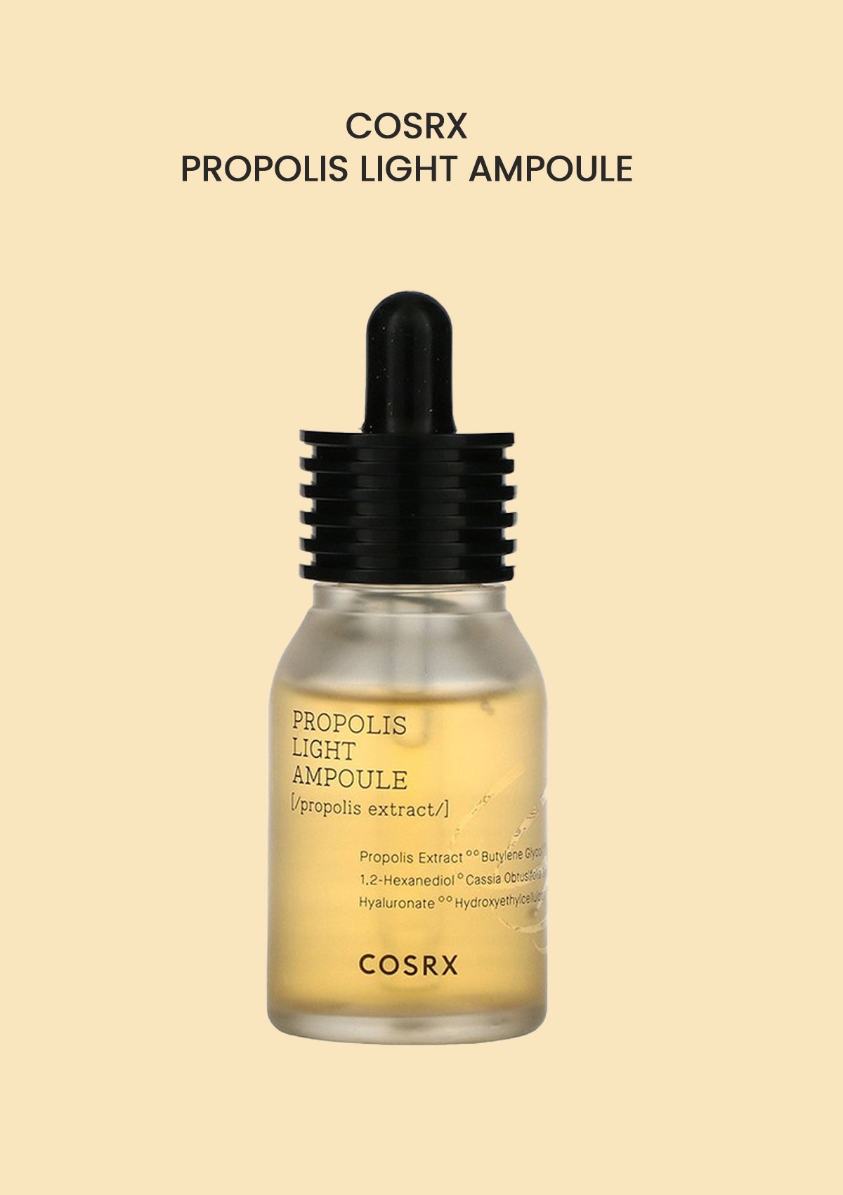 Propolis Extract, Butylene Glycol, Glycerin, Betaine, 1,2-Hexanediol, Cassia Obtusifolia Seed Extract, Sodium Hyaluronate, Hydroxyethylcellulose, Carbomer, Panthenol, Arginine