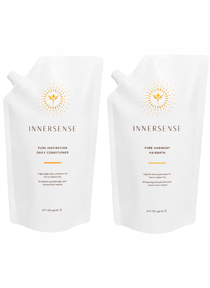 The ultimte Innersense Pure Range Hair bundle - a refill pouch of the Pure Harmony Hair Shampoo and the matching Pure Inspiration Daily Conditoner. A sulphate-free formula ftor fine to medium hair types to leave it healthy, full of body and without residue.