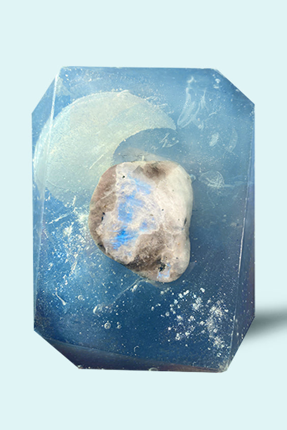 Enhanced with an embedded Rainbow Moonstone crystal, which acts as a prism diffusing energy throughout the aura. It provides psychic protection clears the mind and senses, and aids in lucid dreaming and calm sleep. Aligned with the Goddess, Rainbow Moonstone connects the energies and spirits of Nature. This energy will help to balance the yin-yang vibrations within your body and will nurture your spirit. These beautiful crystals reflect within them the magical healing qualities of the moon's vibrations. A natural essential oil blend of crisp peppermint and cooling eucalyptus brings water energy to this cleansing experience.